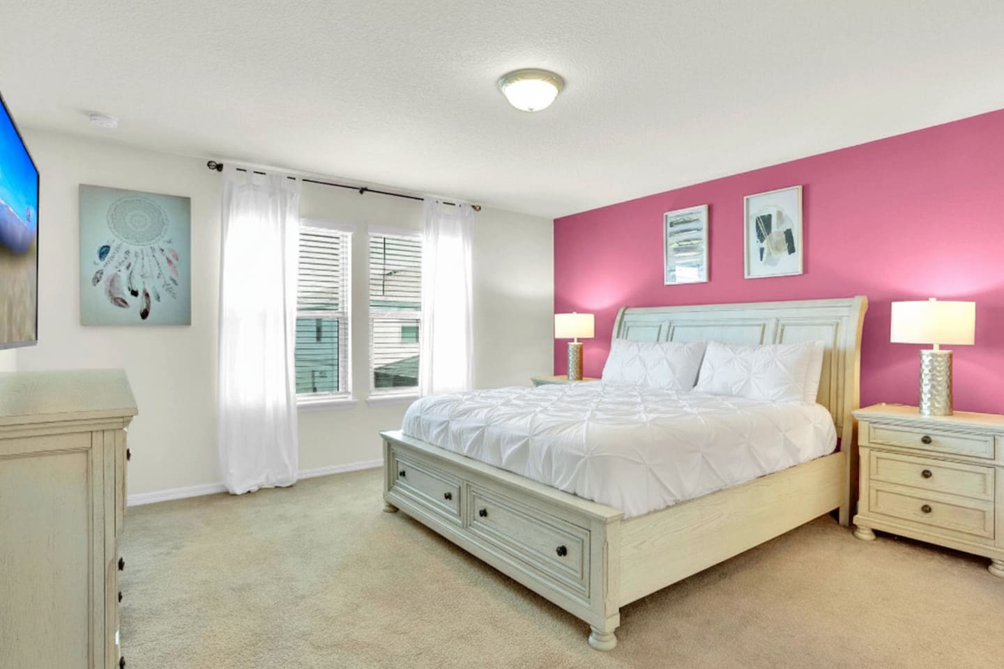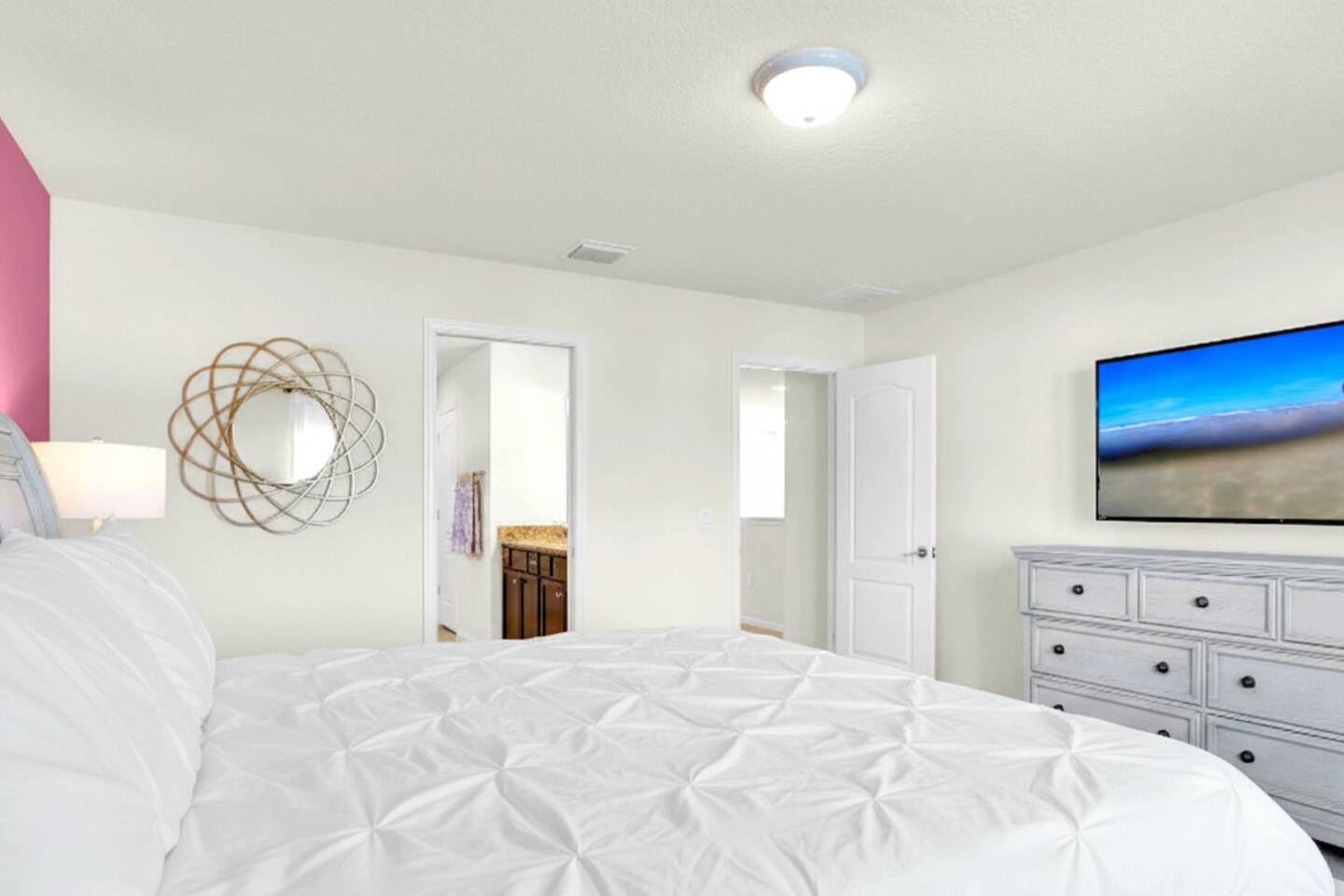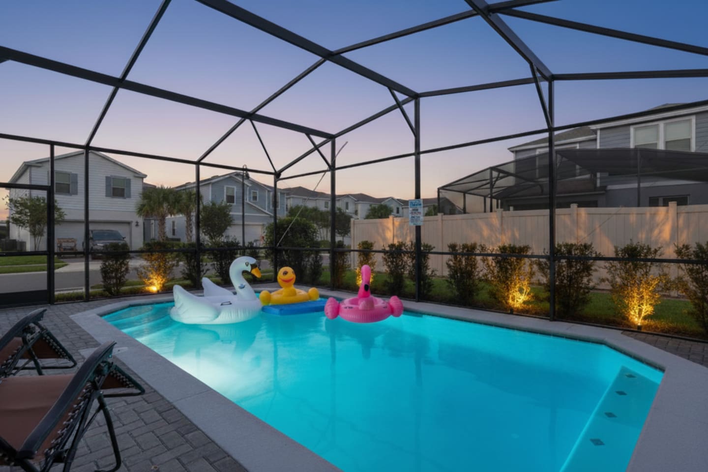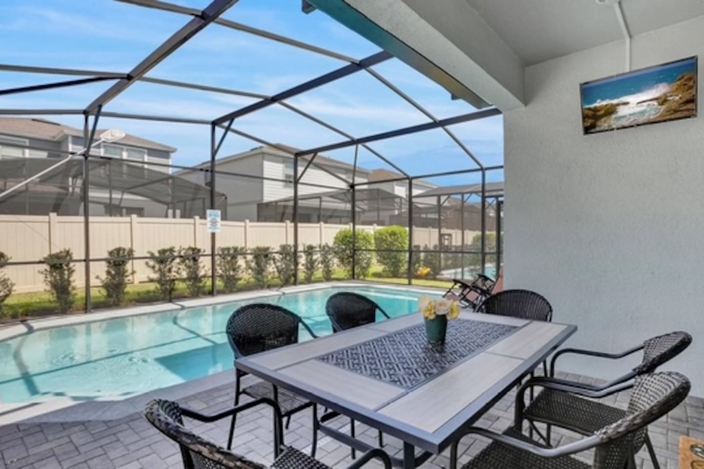 🛏️ Bedroom Layout ✨ 👑 King Suite 1 (Upstairs): King bed, ensuite bathroom & 55" Smart TV 👑 King Suite 2 (Upstairs): King bed, ensuite bathroom & 43" Smart TV 🌟 Twin Room 1 (Upstairs): 2 twin beds & 55" Smart TV 🌙 Twin Room 2 (Upstairs): 2 twin beds & 43" Smart TV 💫 Queen Suite (Downstairs): Queen bed, ensuite bathroom & 55" Smart TV ☀️ Step outside to your private screened pool & spa! Lounge in comfort with zero-gravity chairs, a dining table for six, and an outdoor Roku TV for poolside fun. 💦 Pool heat optional