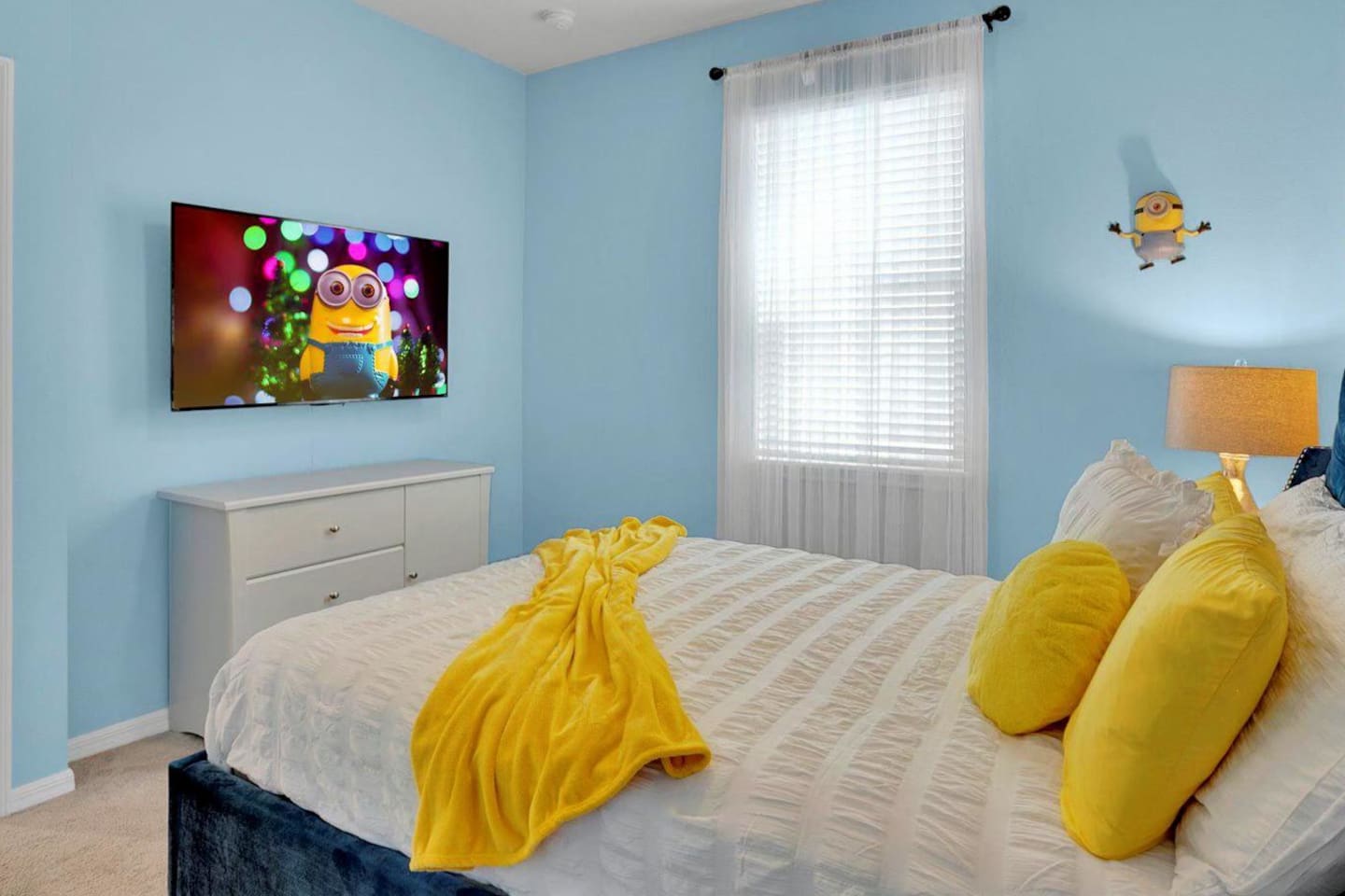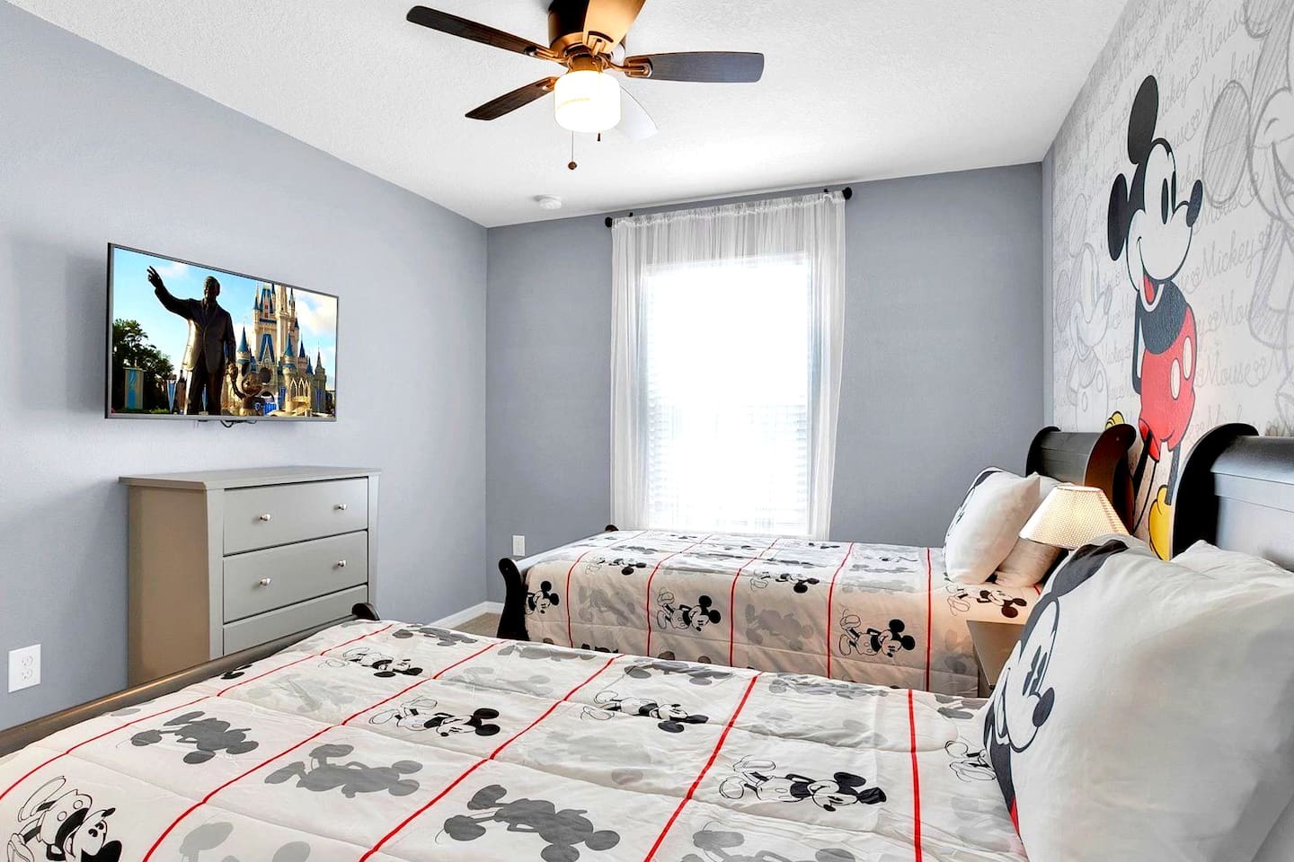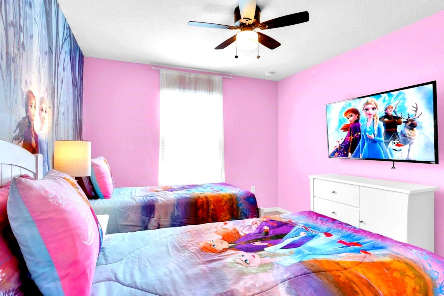 🏊♀️ Private screened pool + spa (heat available for a fee) with outdoor dining, loungers & Roku TV 🔌 Free EV Charger for your convenience ⚡ 🛏️ 5 spacious bedrooms, each with its own Smart TV, including themed rooms: ⭐ Star Wars, 💛 Minions, 🐭 Mickey & ❄️ Frozen 🎬 Open-concept living w/ 70" Smart TV for cozy movie nights 🍳 Fully equipped kitchen w/ seating for 10 indoors + lanai dining 🌴 Resort access: huge pool, splash park, gym, arcade & more 📶 Free WiFi, 🧺 washer/dryer, linens & towels provided